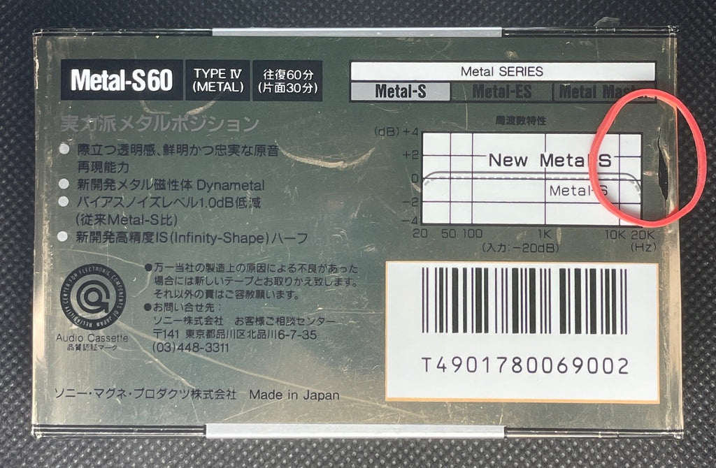 This Metal-S tape seems to be a notch below in quality when compared to the Metal-ES, and a notch higher than the SR (North America) or XR (Europe), according to some literature issued by Sony (Look it up on 45spaces.com). Made for the Japanese market. Scarce.